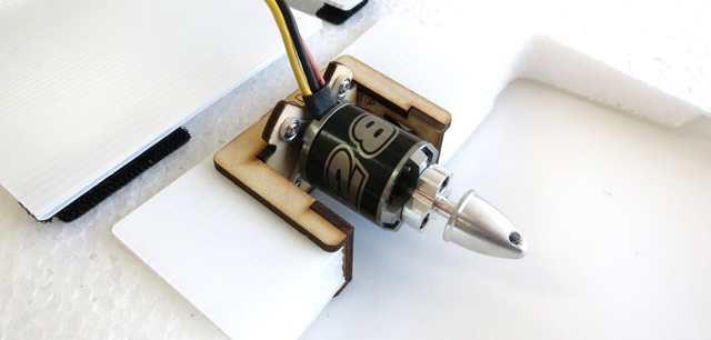Build the motor mount as shown. First glue the sides, then glue the top and bottom.Glue the mount to the wing. Test fit first, then apply CA quickly slide mount in place before the CA cures.