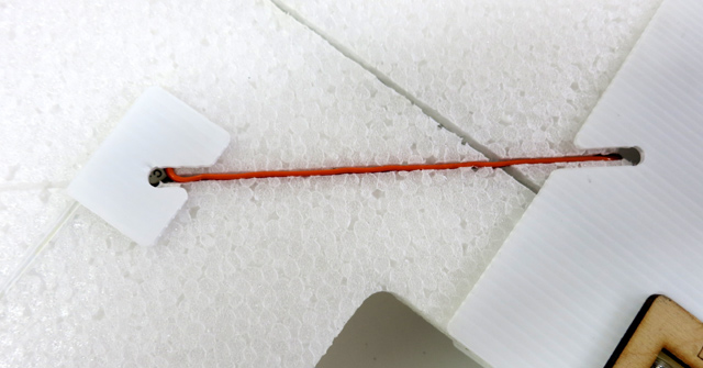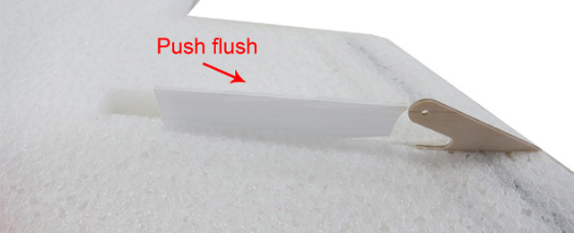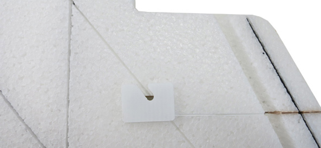 Feed the servo wire through the opening.Install the servo hardware and mount servo.Feed servo wire into bay and tuck into groove.Connect the 15cm servo extension to the right servo.Widen the outer servo arm hole with 1/16" drill bit.Install the quick connects and pushrods as shown. Tighten quick connect nut
