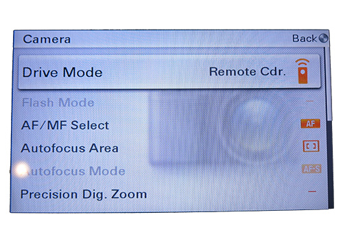 - On your camera go to Menu > Camera > Drive Mode and select Remote Cdr.