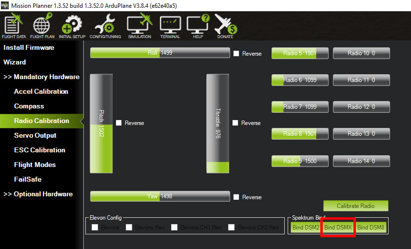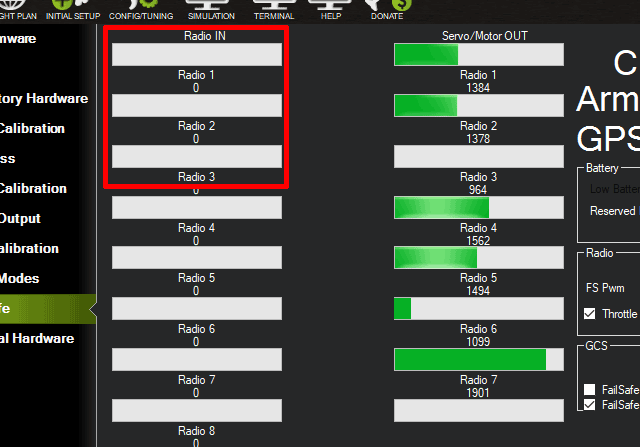 - Start Mission Planner and go to INITIAL SETUP > Radio Calibration.