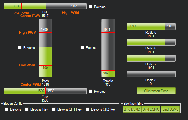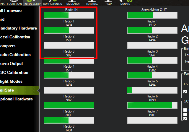 - With RC Transmitter on your Radio 1 and 2 values will be near 1500.