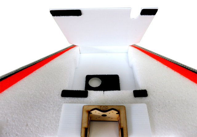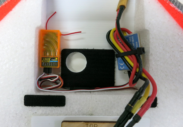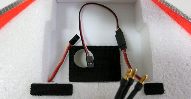 - Glue GoPro base to coroplast hatch. Note orientation of black coroplast base and location ESC wire exit.